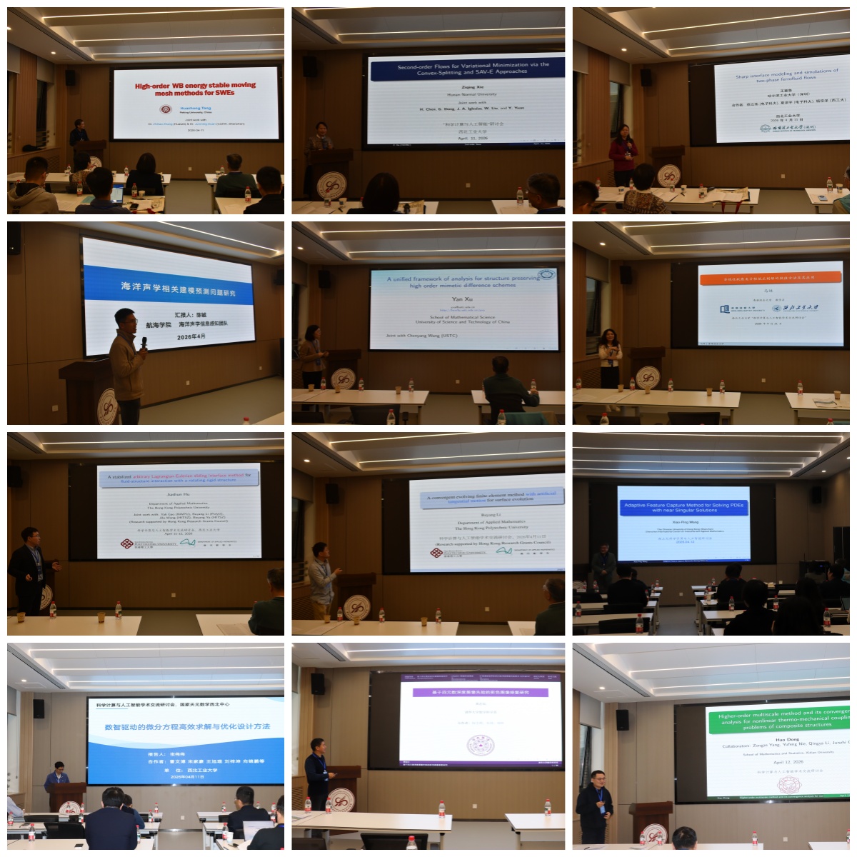 在学术报告环节,研讨会聚焦科学计算、偏微分方程数值方法及人工智能交叉融合等前沿方向,旨在推动传统数值方法与数据驱动方法的协同创新。12位专家学者围绕浅水方程高精度数值格式、变分问题高效求解、多相流与界面问题建模、保结构数值方法、流固耦合与曲面演化问题、自适应特征捕捉、图像修复、数智驱动微分方程求解以及多尺度建模与计算等主题作了精彩报告。报告人与参会人员进行了深入而热烈的交流讨论。与会代表一致认为,报告内容前沿、视角多元,充分体现了科学计算与人工智能深度融合的发展趋势,不仅拓宽了学术视野,也为相关领域研究提供了新思路与新方法,对促进高校间学术合作与人才交流具有积极意义。