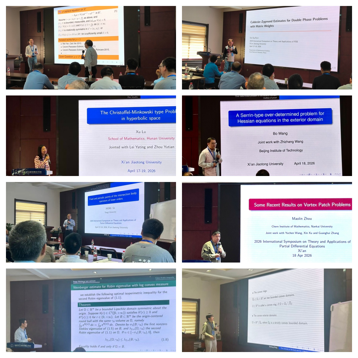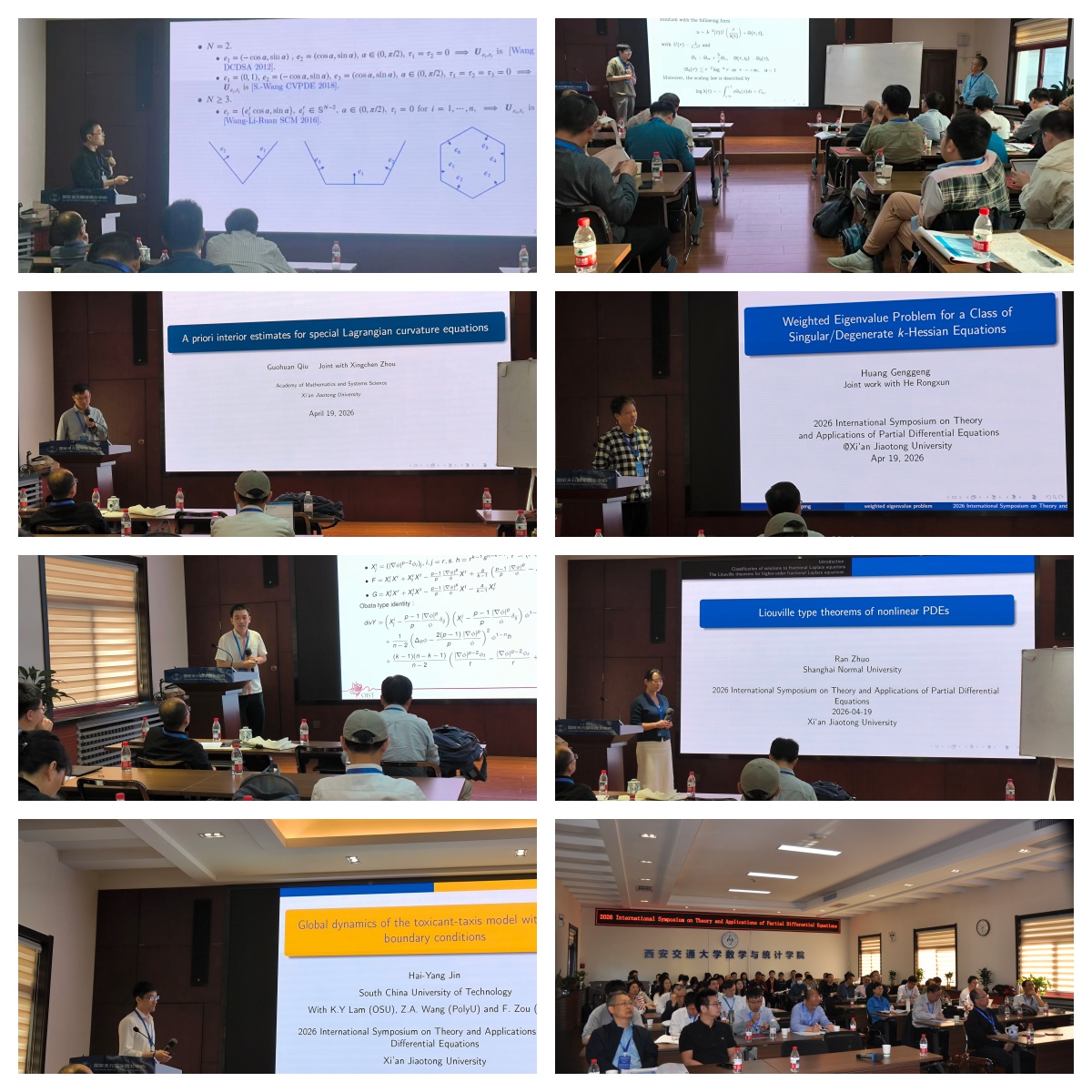 2026年4月17日至19日,由国家天元数学西北中心主办、西安交通大学数学与统计学院承办的“数学丝绸之路”国际论坛之2026偏微分方程理论及应用国际研讨会在陕西西安顺利举行。本次研讨会汇聚了来自中国、韩国、日本等多个国家的资深专家与优秀青年学者,围绕该领域的前沿热点问题展开深入交流,先后呈现了多场精彩纷呈的国际化学术报告。