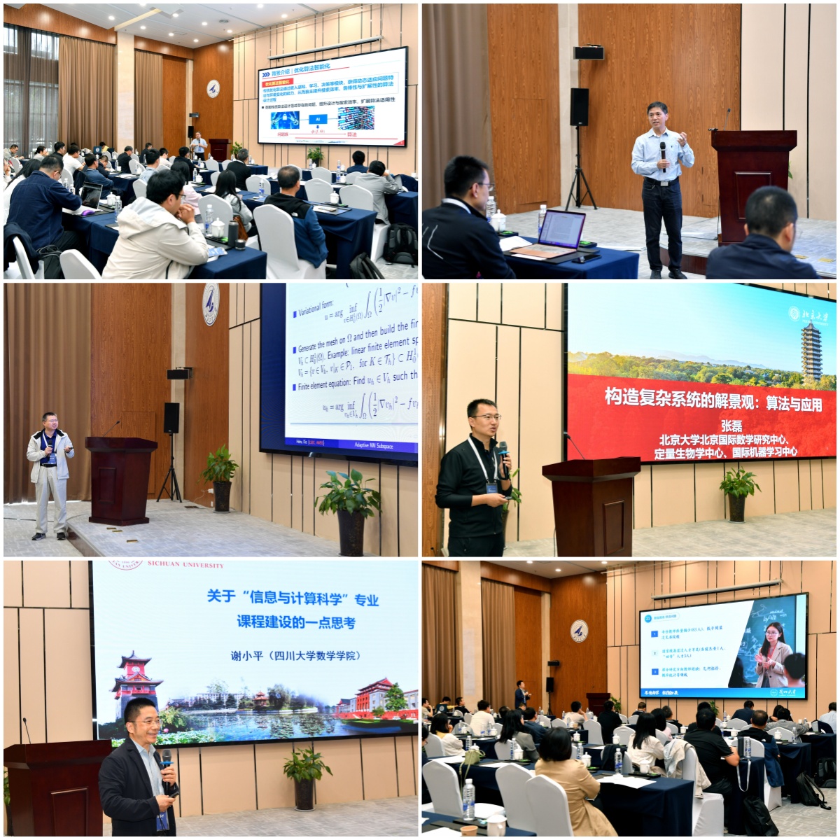 在特邀学术报告环节,清华大学黄忠亿教授作题为 “Image Segmentation via Variational Model Based Tailored UNet: A Deep Variational Framework” 的报告,中国科学院数学与系统科学研究院谢和虎研究员作 “从有限元到机器学习” 报告,北京大学张磊教授作 “构建复杂系统的解景观:算法与应用” 报告。三位专家的报告内容涵盖深度学习、数值分析方法与复杂系统计算等多个前沿方向,为与会者呈现了一场高水平的学术盛宴。在人工智能发展报告与学科建设报告环节,西安交通大学孙建永教授作 “人工智能驱动的大规模组合优化算法、平台与应用” 报告,深入探讨了人工智能与优化算法的结合与应用前景。四川大学谢小平教授和兰州大学杨四辈教授则分别作了关于信息与计算科学专业课程建设和兰州大学数学学科建设情况的报告,为与会者提供了宝贵的经验与思考。